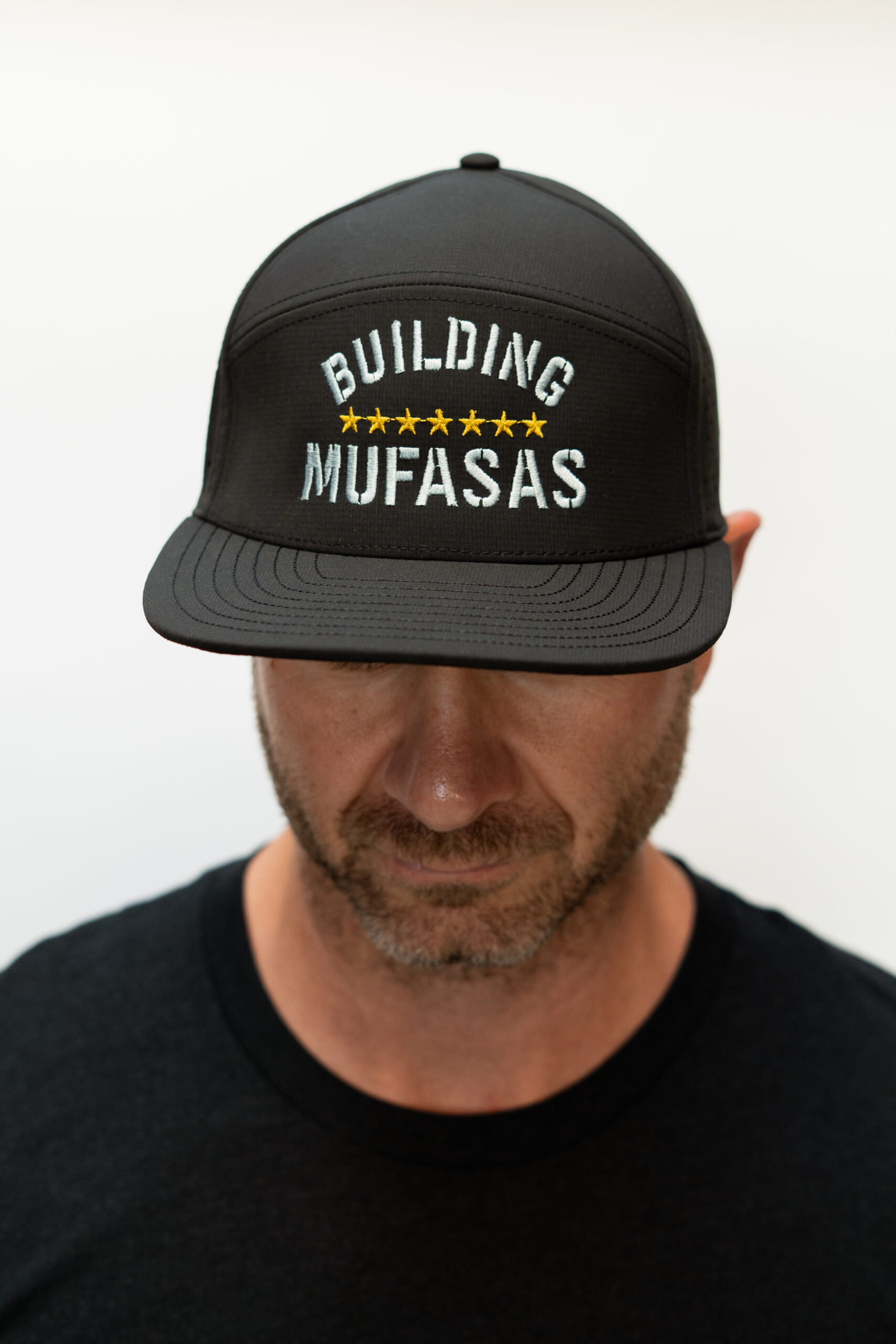 The front features high quality embroidered Building Mufasas text with gold star detailing, giving the hat a premium finish without being loud. The black crown paired with a grey brim creates a versatile color combination that pairs easily with most outfits.