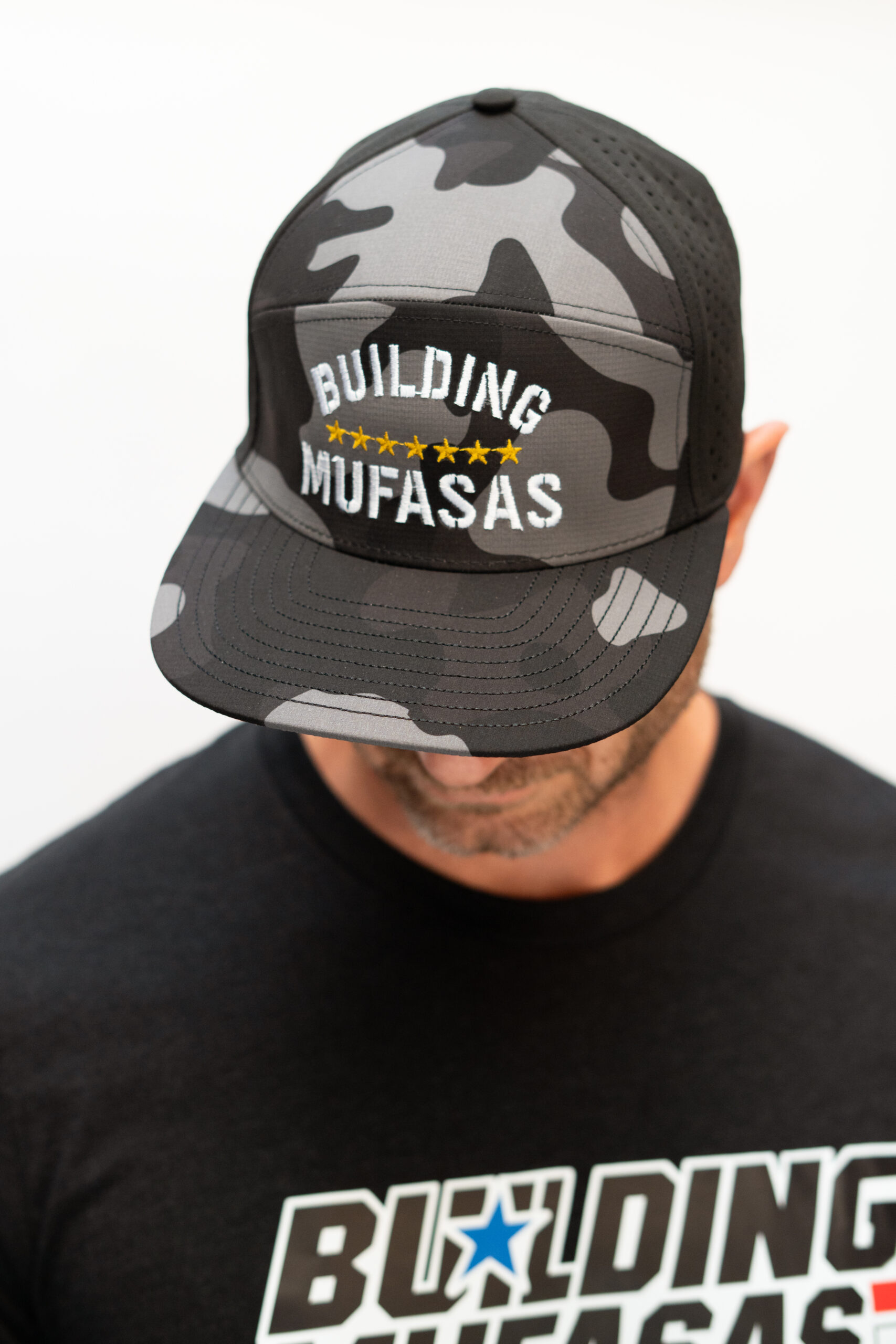 The front features high quality embroidered Building Mufasas text with gold star detailing, adding a premium touch that stands out against the camo pattern. The camouflage design makes this hat a great choice for outdoor wear, work settings, or casual everyday outfits.